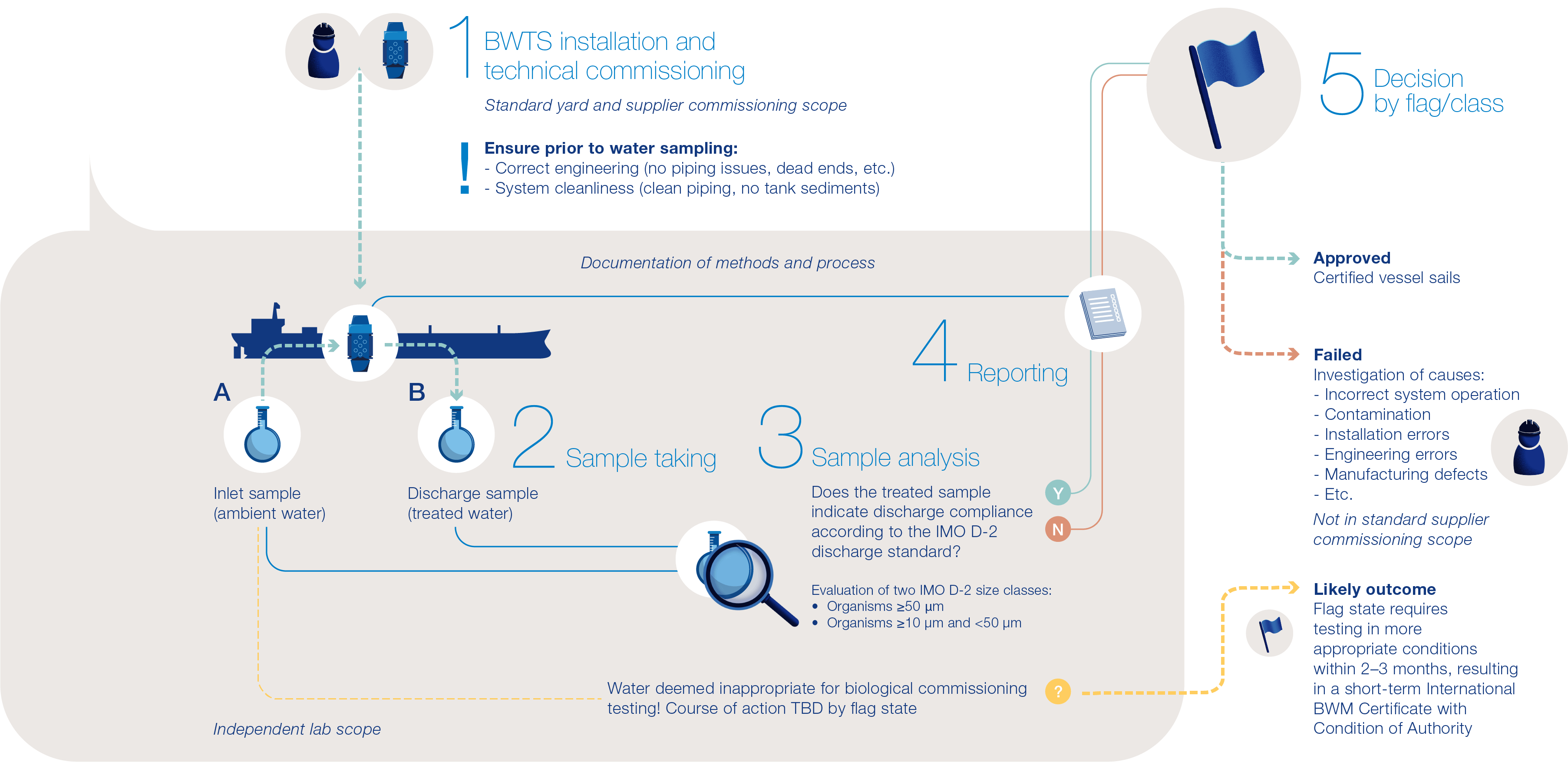 Biological commissioning testing is defined step-by-step in BWM.2/Circ.70/Rev.1, Guidance for the commissioning testing of ballast water management systems. The key steps – water sampling and analysis – must be performed by an independent lab. This infographic will help you understand the testing process and the potential outcomes.