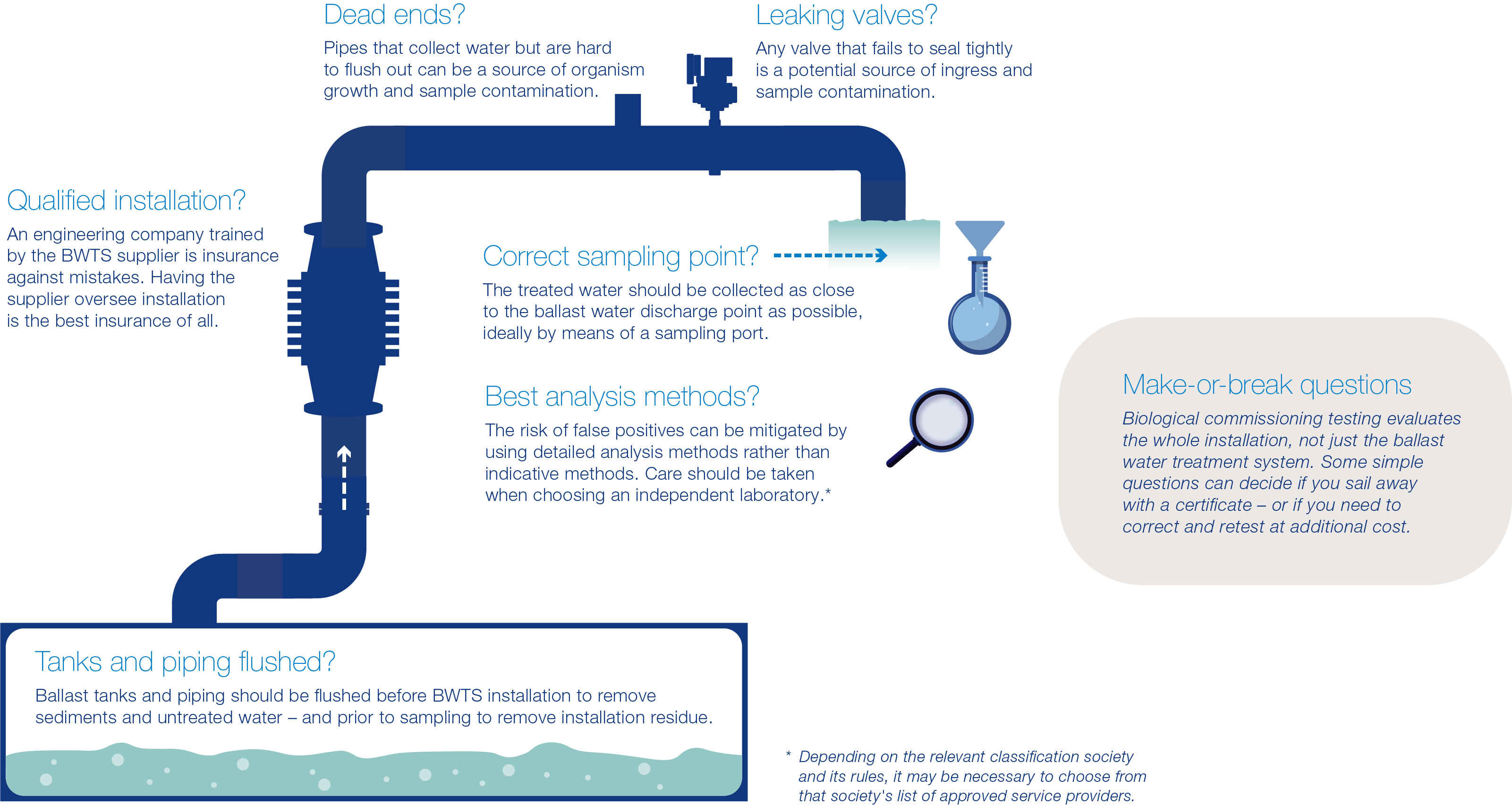 Since biological commissioning testing evaluates the entire ballast water treatment system installation, even a small problem in a tank or pipe can lead to failure. But the most likely causes of failure are also the easiest to avoid. Making correct choices and preparations – even before you install – lays the groundwork for success. Learn how to get it right in this infographic.