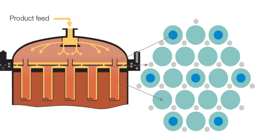 キャプション:FilmVap のプラッターディストリビューターは、垂直加熱管内で液体を均一に流し、管壁全体をしっかりと濡らすことで、付着物(Fouling)の発生を最小限に抑え、洗浄間隔を延ばします。