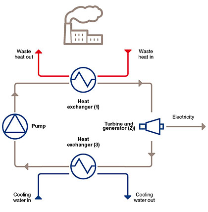 The organic fluid has a boiling point lower than that of water, making it possible to use low-temperature waste heat to generate electricity.