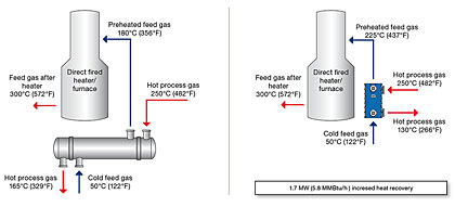 In this example heat from a process gas stream is recovered and used for preheating the feed gas of a direct fired heater. A shell-and-tube is replaced by a compact heat exchanger, increasing heat recovery and reducing gas consumption. The result is an increase in heat recovery by 1.7 MW (5.814 MMBtu/h).